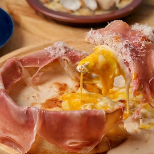 【最高の組み合わせ!生ハム×温玉×チーズ】生ハム温玉シカゴピザ♪とろとろのチーズがたまらない